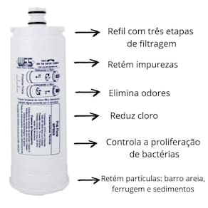 Código: wfs028. Vida útil: 3000 litros. Vazão: 50/60 litros/hora. Retenção de partículas: classe c 5 a 15 micra . Sem redução de cloro livre.
