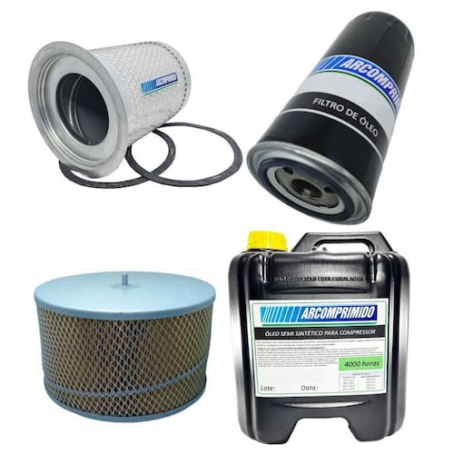 Kit de Filtros e 20L de Óleo 4000hrs Similares para Compressor Techto Platinum TB50. O kit contém: * 01 Filtro Separador de Ar e Óleo * 01 Filtro de Óleo * 01 filtro de Ar * 20L de Óleo Semi Sintético 4000hrs