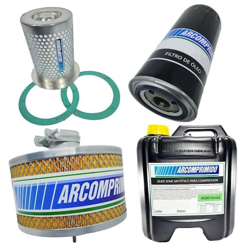 Kit de Filtros e 20L de Óleo 4000hrs Similares para Compressor Techto Supreme SD40. O kit contém: * 01 Filtro Separador de Ar e Óleo * 01 Filtro de Óleo * 01 filtro de Ar * 20L de Óleo Semi Sintético 4000hrs