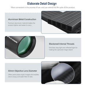 Este telescópio localizador tem uma abertura de 50 mm e, portanto, fornece uma imagem particularmente brilhante. Objetos que você nem consegue ver usando apenas a olho nu, normalmente ficam visíveis diretamente. Além disso, se você estiver tentando localizar um dos DSOs mais brilhantes, isso não será mais capaz de permanecer oculto, entregando-se ao seu olhar de pesquisa. Um mapa de estrelas com estrelas de referência com as quais se pode orientar a si mesmo é geralmente utilizado para encontrar objetos específicos. Algumas das estrelas mostradas nos mapas das estrelas não podem ser vistas, ou são difíceis de ver, a olho nu. Este telescópio localizador disponibiliza um grande número de estrelas – uma grande vantagem para ser capaz de localizar objetos com sucesso. O telescópio Astromania 9x50 possui miras integradas para permitir que você encontre o objeto correto com mais facilidade e coloque-o no meio do campo de visão do telescópio principal. Os fios foram mantidos bem finos, mas ainda são muito visíveis contra o céu noturno. Dois parafusos de ajuste e uma mola de compressão permitem um alinhamento muito rápido com o telescópio principal. O foco preciso pode ser alcançado girando a lente objetiva. O telescópio localizador caberá em uma grande variedade de suportes: Skywatcher, Celestron, Vixen, Orion, GSO e muitas outras marcas têm sapatos de alcance compatíveis. - Mira localizadora de 9 x 50 mm com diâmetro de lente objetiva de 50 mm; DSOs mais brilhantes diretamente visíveis - Disponibiliza um grande número de estrelas que têm uma grande vantagem para localizar objetos com sucesso - Desfrute de um ângulo de visualização confortável de 90 graus e vertical com imagem não invertida; o prisma integrado exibe objetos de maneira semelhante àquele com binóculos ou telescópios; torna o uso de um mapa estelar muito mais fácil e observar perto do zênite em ângulo relaxado - A ótica acromática fornece uma imagem brilhante; fiel à vida com ampliação de 9x; as superfícies ópticas foram multirevestidas para evitar reflexos irritantes - O localizador se encaixa na maioria dos telescópios; foco fácil na lente objetiva; ajuste do alinhamento do telescópio através de dois parafusos e mola