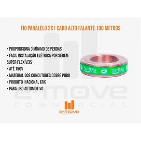Fio 2x0,75 100% cobre cabo alto falante 100 metros Somos a e-move. Prezamos pela qualidade, velocidade e confiança nas suas compras. ----------------------------------------------------------------------------------------------------------------- Fio 2x1 100% cobre cabo alto falante 100 metros Descrição do produto: Se você está em busca de um cabeamento de qualidade para configurar a instalação do seu som automotivo e garantir máxima fidelidade sonora, este cabo de força da technoise é a sua melhor escolha. Aplicação: Seu condutor é 100% em cobre livre de oxigênio, material de excelente condutividade que proporciona o melhor desempenho na transmissão elétrica e incrível performance do sistema de som. Benefícios: Possui 100 metros de comprimento e diâmetro externo de 1mm. O revestimento é confeccionado em pvc transparente de alta resistência, resultando em um produto de durabilidade máxima e com custo-benefício excelente. Características técnicas:: Fio cristal flexível Revestimento em pvc ultra flexível Até 150v Medida: 2 x 1,00mm Rolo de 10 metros Núcleo de puro cobre Produto nacional Para uso automotivo Itens inclusos: 01 fio 2x1 100% cobre cabo alto falante 100 metros : A technoise concede do produto pelo prazo de 6 seis meses. Este prazo compreende, 90 noventa dias como legal prevista no código de defesa do consumidor, complementada com a technoise. ----------------------------------------------------------------------------------------------------------------- Recomendações antes da compra Verifique a compatibilidade do produto para garantir que não haja nenhum problema de uso. Verifique a tensão, potência, impedância e outros detalhes que impossibilitem a instalação ou que possa causar danos ao produto ou veículo. Para os produtos que necessitam de instalação, antes da mesma deverá ser feito o teste de bancada para verificação do funcionamento dele. A instalação deve ser feita por profissionais capacitados, não nos responsabilizamos pelo uso incorreto ou instalação incorreta do usuário ou do profissional não qualificado. ---------------------------------------------- Dúvidas frequentes ---------------------------------------------- 1. Vocês enviam em até quanto tempo após a compra R: nossos produtos são enviados em até 24 horas úteis. 2. Vem com R: todos os produtos listados são enviados com eletrônica juntamente com o produto adquirido. R: sim, temos de todos nossos produtos anunciados. 5. Posso retirar o produto R: não temos loja física, apenas online. 6. Produto tem 7. Posso devolver o produto R: em médias os produtos podem ser devolvidos em até 30 dias, exceto eletrônicos que são 7 dias, desde que esteja em sua embalagem e sem sinais de uso. 8. Vocês entregam em todo o país Qualquer outra dúvida, ficamos à disposição Marca: Não Informado