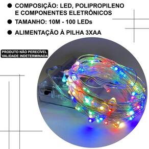 Especificações: - cor: colorido - material: led, polipropileno e componentes eletrônicos - tipo de alimentação: 3 pilhas aa não inclusas - tamanho: 10 metros - quantidade de led's: 100 led's - peso produto : 0,60g - volume: 01 peça - origem: china - marca: wincy casa