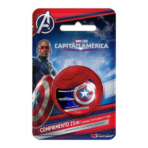 Características Adicionais: Fio dental com cera. Com um delicioso sabor menta. Caracterizado com o tema do Capitão America. Possui nova formulação exclusiva que não desfia e desliza melhor entre os dentes, removendo toda placa bacteriana dos espaços mais escondidos entre os dentes.