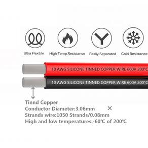 - Fio de fio ultra flexível, baixa resistência, fio de silicone puro de alto desempenho. - Núcleo interno de cobre estanhado de alta qualidade, pode manter o fio de cobre por um longo tempo e não oxida. - Escopo: Aplicável a todos os tipos de eletroeletrônicos e eletrônicos, eletrônicos industriais, modelos de aeronaves, carros, modelos de navio, baterias, motores e outros isolamentos de elos. Especificações: - Cor: Preto + Vermelho - Material: Condutor - cobre estanhado - Isolador: Silicone - Número do fio: 10 AWG - Comprimento total: 3 m preto e 3 m vermelho - Número de ações: 1050 - Diâmetro: 0 cm - Diâmetro do fio: 0,3 cm - Diâmetro externo da bainha: 1,1 cm - Espessura do isolamento: 0,1 cm - Resistência do condutor: 9,8 ohm mil metros - Tensão nominal: 600V - Tensão de teste: 2000 V - Corrente de urso: 43A - Faixa de temperatura: -60 ~ + 200 - Tolerância do diâmetro externo: 0 cm Embalagem: Kit de fio de silicone calibre 10: 2 fios paralelos condutores, vermelho e preto, cada cor 3 metros, total de 6 m - TUOFENG Fio de silicone de 10 AWG amplamente utilizado para modelos de brinquedos de controle remoto, equipamentos eletrônicos de cabo de fixação de bateria, para fazer cabos de remendo de alta corrente/baixa resistência. ATV, caixa de carregamento RC, testador, estação de energia portátil. Sistema de energia solar, soprador de neve, helicóptero RC, compressor de ar, baterias, lâmpadas, eletrodomésticos, aparelhos de aquecimento elétrico, metros, fio condutor do motor e campos digitais - Fio de silicone calibre 10 - fios super flexíveis de 1050 fios de cobre estanhado de 0,08 mm - Altamente eficiente - Impedância super baixa para uma conexão altamente eficiente. - Fio de silicone resistente a altas temperaturas. Temperatura: -60 graus Celsius 200 graus Celsius, tensão nominal 600V, corrente de urso: 43A - Em fio de cobre revestido - o fio revestido de estanho pode durar mais que a concorrência em 10 dobras devido às suas propriedades resistentes à corrosão e à oxidação. Isso significa que a resistência interna do fio permanece baixa por mais tempo, canalizando mais energia para seus modelos, dispositivos ou outras aplicações de RC - Kit de fio de silicone calibre 10: 2 fios paralelos condutores, vermelho e preto, cada cor 3 metros, total de 6 metros.