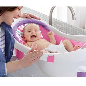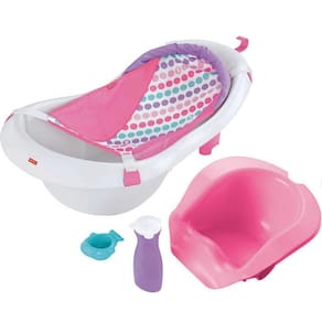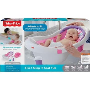 A banheira 4 em 1 Sling ´n Seat da Fisher-Price é completa: conta com um porta-bebê de malha macia desenvolvido para o primeiro banho do bebê e um assento de apoio para bebês que adoram balançar, além de uma espaçosa banheira com concha e garrafa para brincar na água.