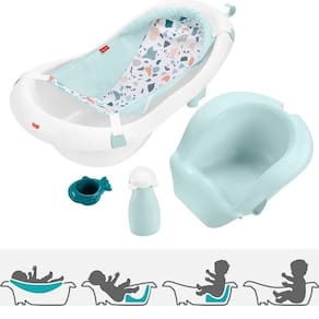 A banheira 4 em 1 da Fisher-Price pode fazer tudo, desde a tela de apoio projetada para os primeiros banhos do bebê, até a baleia e ao gêiser (ou seriam apenas uma concha e uma garrafa de água?).