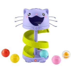 Esse simpático gatinho apresenta uma torre de bolas em camadas com 4 bolas de "fios" coloridos fáceis de agarrar e 1 bola de peixe com chocalho que as crianças podem colocar na boca do gatinho para enviá-lo pela pista, pronto para começar a diversão novamente.
