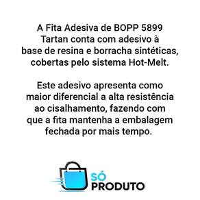 A fita adesiva de bopp 5899 tartan conta com adesivo à base de resina e borracha sintéticas, cobertas pelo sistema hot-melt. Este adesivo apresenta como maior diferencial a alta resistência ao cisalhamento, fazendo com que a fita mantenha a embalagem fechada por mais tempo. A aplicação da fita para empacotamento pode ser feita manualmente por dispensadores e equipamentos semiautomáticos ou automáticos. Está disponível na versão lisa, nas cores marrom e transparente. A 3m recomenda que cada usuário seja responsável por testar a fita e verificar se é adequada para cada aplicação e necessidade.
