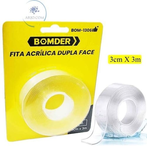Fita acrilica dupla face 1306 Fita acrílica dupla face 3cm x 3m bom-1306 Pode ser em plástico, metal, letreiros, decoração, entre outros; Dimensões do produto: 3cm x 3m; Espessura do produto: 2mm; Marca: bomder; Modelo: bom-1306. : 90 dias. Marca: Não Informado