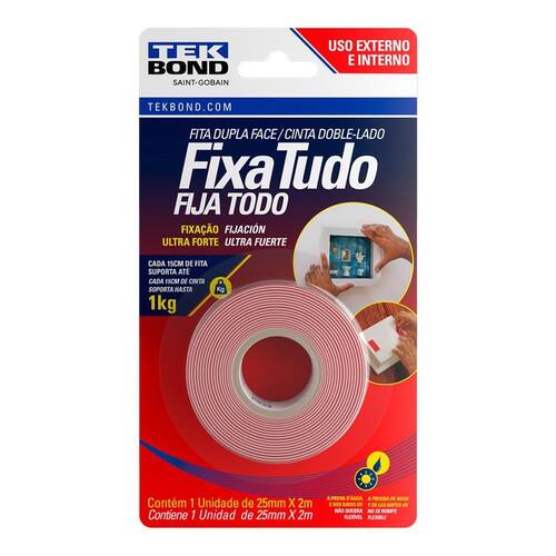 A Fita Fixa Tudo Exterior Tekbond é uma fita acrílica que foi desenvolvida para promover uma fixação ultra forte de maneira fácil, rápida e segura, além disso, ela tem resistência aos raios UV, umidade, bem como aos efeitos das intempéries. Com ela, você pendura quadros, objetos de decoração, canaletas e uma infinidade de outras peças.