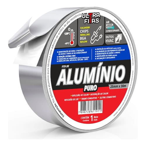 A fita Adesiva de Alumínio Puro ULTRA FITAS foi desenvolvida para atender a maior parte do mercado brasileiro, nas áreas de eletrônica, elétrica, refrigeração, construção civil, aviação entre outras.