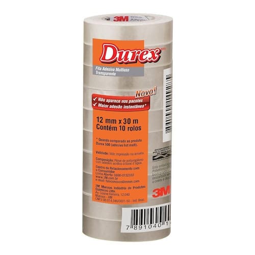 - 1 Pacote de Fita Adesiva Multiuso Transparente Durex 12mm x 30m com 10 Rolos 3M