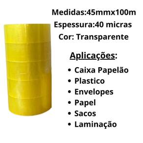 Especificações: Indicação: aplicações diversas para fechamento de caixas, mudanças, logística, indústria, pacotes, encomendas. Cor: transparente. Largura: 45mm; Comprimento 100 metros.