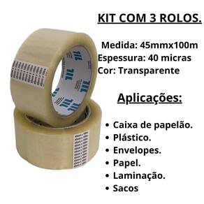 Quantidade: Kit com 3 unidades de fita adesiva transparente 45mm x 100 metros. Material: BOPP + Adesivo Indicação: Aplicações diversas para fechamento de caixas, mudanças, logística, indústria, pacotes, encomendas. Cor: Transparente. Largura: 45mm Espessura: 40 micras; Comprimento 100 metros.