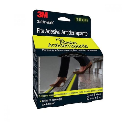 A fita adesiva antiderrapante fosforescente Neon Safety-Walk da 3M ajuda a prevenir quedas e escorregões também no escuro. Ela recarrega o brilho após exibição à luz.