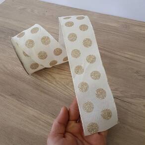 FITA ARAMADA EM TECIDO COM BOLINHAS ;DOURADAS, ROLO COM 9,14 METROS DE COMPRIMENTO X 6.30cm ;DE LARGURA.