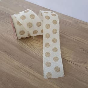 Material: Tecido, Glitter e Arame;Peso: 114gr.Cores: Bege e Dourado; ;Conteúdo da Embalagem: 1 Rolo.Largura: 6.30cmComprimento: 9,14m