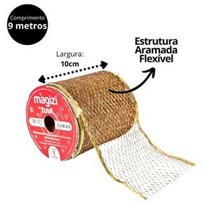 Sua estrutura com bordas aramadas flexíveis permite moldar facilmente os laços e ajustar o formato conforme o desejado, mantendo a firmeza e o volume. O acabamento dourado com glitter proporciona um efeito luxuoso, refletindo a luz e destacando qualquer composição natalina.
