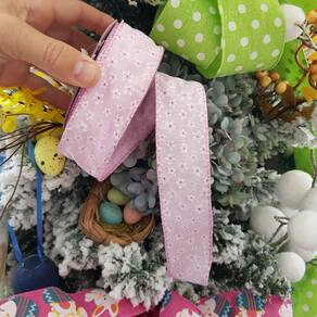 Fita Decorativa aramada em poliéster rosa com mini flores brancas, Rolo com 9,14m de comprimento X 4cm de largura.
