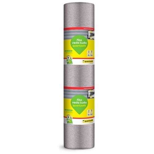 Fita Veda Tudo Quartzolit é uma fita autoadesiva com película de alumínio flexível, protegida por um filme de PVC que é retirado ao aplicar a fita, facilitando a colagem ao substrato.