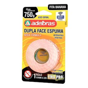 Fita Banana Dupla Face Espuma Fixa Pro - 12mm X 2m Até 750g é indicada para montagem de união de placas, plásticos, sinais, emblemas, uso geral na indústria, espelhos, placas de sinalização, vidros, acrílicos, policarbonatos, laminação de vidros, este produto possui excelente capacidade de conformação resistência em aplicações internas e externas.Especial para pendurar objetos leves, bricolagem, artesanato.Esse modelo de fita dupla face espuma dispensa o uso de pregos e parafusos e evita furos na paredeA superfície deve ser limpa e seca, livre de imperfeições e isenta de graxa, óleo, primer, cera, pó ou resíduos contaminantes. Evitar superfícies repintadas ou com pintura recente. Pressionar a fita durante 30 segundos para aplicação.Especificações:Marca: Adelbras.Embalagem: Blister com 1 rolo.Tipo de Fita: Dupla Face Espuma Banana .Medidas: 12mm x 2 metros.Resistência: cada 25cm de fita suporta até 750 gramas.Cor: Branca.Composição: Espuma de polietileno com espessura de 1,0mm e adesivo acrílico solvente em ambos os lados.