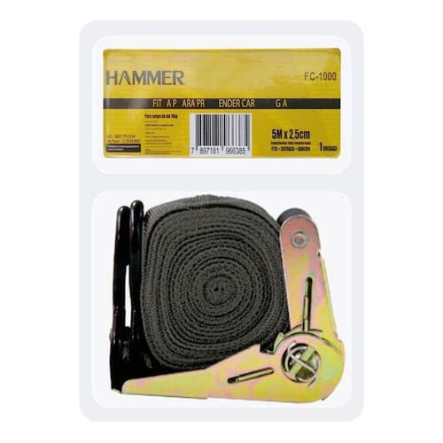 Fita cinta com catraca para amarração de carga 5 metros A cinta com catraca para amarração de carga 5 metros da hammer é indicada para para prender cargas com carga máxima de de até 70 kg Possui medidade de 5 m metros de comprimento e 2,5 cm de largura. Cintas de amarração de carga em polipropileno com catraca. Características: Comprimento total considerando fita+ catraca+ gancho = 5 metros. Composição: cinta em polipropileno; Largura da tira: 2,5 cm; Largura da alavanca da catraca: 3,5cm; Cor da conta: preto.