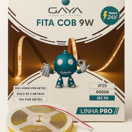 A fita de led cob 9w/m 24v 4000k gaya linha pro foi desenvolvida para quem busca um produto com máxima qualidade de luz, acabamento contínuo e alta eficiência luminosa. Com design moderno e tecnologia de ponta, ela entrega 900 lúmens por metro, com distribuição homogênea da luz, ideal para aplicações residenciais, comerciais e corporativas.
