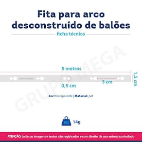 Fita corrente para arco descontruído de balões 5m Faça da sua festa de aniversário ou festa infantil um verdadeiro espetáculo Com a nossa fita para arco desconstruído de balões, você poderá criar decorações incríveis, cheias de cores e alegria. As crianças vão se encantar com a magia que os balões trazem para a festaCaracterísticas:Super fácil de usarFeita com materiais recicláveis a partir de garrafas petPermite você criar arranjos personalizados incríveis e em pouco tempoCompatível com diferentes tamanhos de bexigas ReutilizávelCompatível com balões laminados, bubbles e balões de látex de qualquer tamanhoEspecificações técnicas:Marca: GH3 Festas e Eventos Modelo: Fita para arco desconstruído de balões 5m Quantidade: 1 unidadeMaterial: PETCor: transparenteComprimento: 5mEspaçamento: 3cmLargura: 1,5cmTransforme sua festa em um evento inesquecível com a fita de arco desconstruído. Deixe sua imaginação voar alto e garanta o sucesso da sua festaObrigado pela visita e boas comprasATENÇÃONossas imagens e textos são registrados e com direito de uso autoral controlado e reservado a essa loja e as lojas parceiras devidamente autorizadas em contrato.