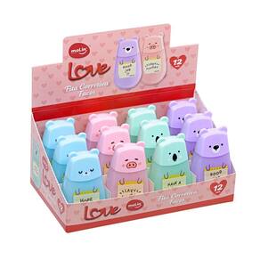 Além disso, a Fita Corretiva Love Faces está disponível em quatro cores translúcidas diferentes: azul, rosa, verde e lilás. Escolha a sua favorita ou colecione todas!
