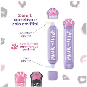 A Pet Tape é um item 2 em 1, pois possui fita corretiva em um lado e cola em fita no outro. Com formato de patinha, ela é super prática de usar e vai deixar o seu material escolar ou de escritório muito mais divertido.