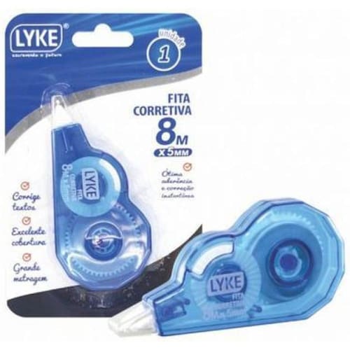 Fita corretiva LYKE de 5mm x 8m, de fácil manuseio, ótima cobertura e secagem rápida. Ideal para uso em escritórios e também em ambiente escolar. Embalagem: blister com 1 unidade.