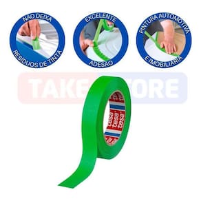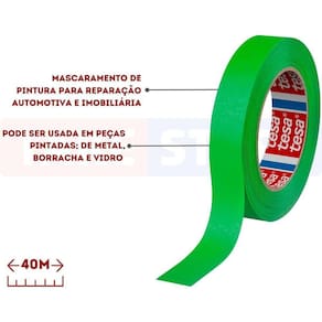 Especificações técnicas: - Marca: Tesa - Cor: Verde - Modelo: Mascaramento de Pintura Automotiva - Cód. Referência: 50124 - Tamanho: 40m x 18mm - Espessura total: 8125 m - Material do suporte: Papel levemente crepado - Tipo de adesivo: Borracha natural - Força de tensionamento: 30 N/cm - Rasgabilidade manual: Muito bom - Adesão ao aço: 2,5 N/cm
