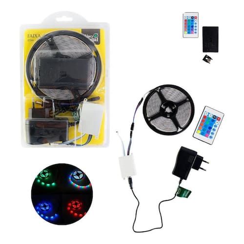 -efeitos de iluminação: 5 tipos de transições e piscas -cores RGB: Vermelho, Verde e Azul -alimentação: Bivolt -potência: 10W, 0,02A -comprimento: 5 metros -leds: 300 unidades -material: LED SMD5050 , Polipropileno e Componentes Eletrônicos -peso: Aproximadamente 120g