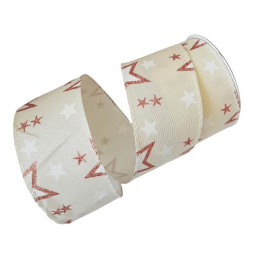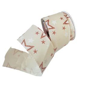 Fita Decorativa Natal aramada em tecido bege com estrelas brancas e rose, Rolo com 9,14m de comprimento X 6.50cm de largura.