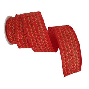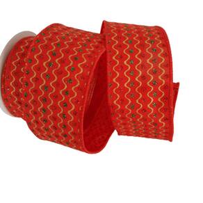Fita Decorativa de Natal aramada em poliéster vermelha com pingos de glitter colorido, riscos dourados e borda costurada com fios, Rolo com 9,14m de comprimento X 6.50cm de largura.
