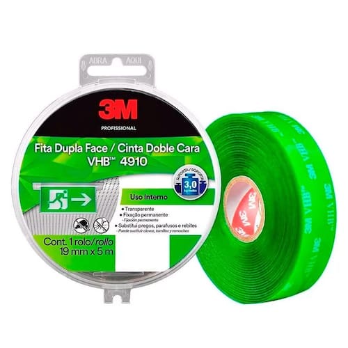 A Fita Dupla Face 3M VHB 19mm x 5m 4910 é a solução ideal para quem busca uma adesão de alta resistência e durabilidade. Projetada com a avançada tecnologia VHB Very High Bond , esta fita proporciona uma fixação segura em superfícies diversas, como metal, vidro, plástico e madeira.