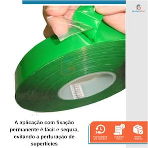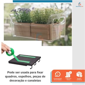 INSTRUÇÕES DE USO E MANUSEIO: 1. Faça a marcação prévia no local onde deseja aplicar o objeto desejado. Certifique-se de que a parede ou local onde deseja aplicar o objeto, bem como o próprio objeto estejam livres de sujeira e oleosidade; 2. Corte a fita na medida e quantidade suficiente para sustentar este objeto; 3. Aplique a fita no objeto desejado e remova o filme protetor; 4. Pressione o objeto com firmeza por 1 minuto no local desejado;