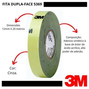 Composição: Adesivo sintético à base de éster de ácido acrílico, alto poder de adesão. - Fita Dupla Face 3M utilizada para a fixação de inúmeras peças externas ou internas aos veículos no mercado de reposição; - Possui densidade média, e viscoelasticidade, permitindo seu alongamento e relaxamento quando submetida a esforças, minimizando a tensão sobre a linha de adesivo; - Possui uma excelente adesão inicial e alta resistência ao arrancamento e cisalhamento; - Resiste à solventes e à intempéries.