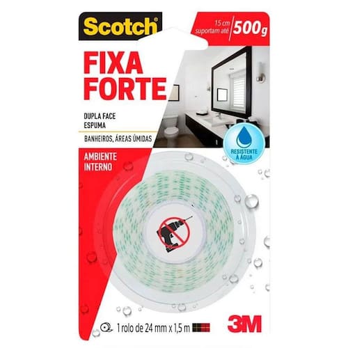 A fita dupla face 3M Scotch fixa forte banheiro é a única indicada para fixar de forma permanente espelhos, quadros, objetos decorativos e acessórios em banheiros, devido a sua resistência à umidade do ambiente. Sua aplicação é fácil, rápida e segura, evitando furos e danos em revestimentos e canos.