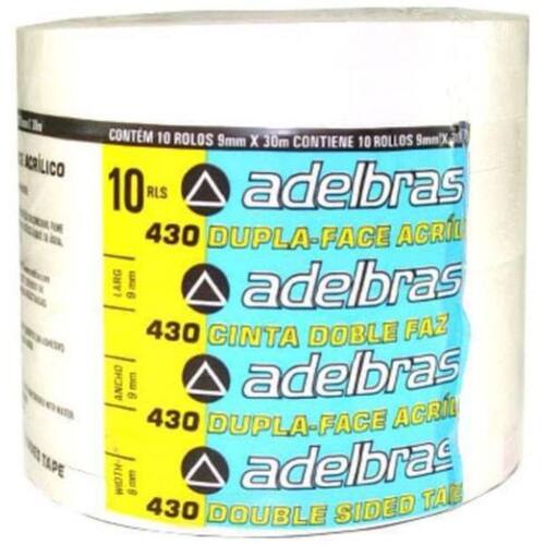 Fita Dupla Face Polipropileno 09MMX30MTS. PCT com 10 Un A fita Dupla face pode ser Utilizado fixação de cartazes, enfeites ou arranjos, montagens, usos gerais para decoração em festas, em estúdios de arte ou agências de propaganda. Não aparece quando aplicada.É composta de Filme de polipropileno biorientado coberto com adesivo acrílico à base de água em ambos os lados. Liner branco de papel siliconizado.Tamanho: 9mmx30m Marca: Não Informado Ean: 7896603846359