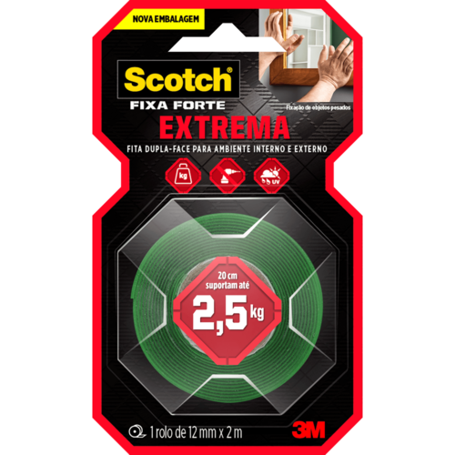 Fita Dupla face Scotch 12MM X 2M Fixação Extrema e Permanente - HB004750087 - 3M Descrição: A Fita Dupla Face 3M Scotch® Fixa Forte Fixação Extrema é a solução mais prática para fixar de forma permanente objetos de decoração pesados, como espelhos, quadros, painéis, lousas, entre outros. Sua aplicação é fácil, evitando furos e sujeira. O adesivo utilizado na fabricação desta fita é de alto desempenho e apresenta extraordinária força de fixação em aplicações de longa duração. A força de adesão e de coesão das fitas da família Fixa Forte são significativamente maiores do que das fitas adesivas convencionais. Detalhes: A Fita Dupla Face 3M Scotch® Fixa Forte Fixação Extrema é a solução mais prática para fixar de forma permanente objetos de decoração pesados, como espelhos, quadros, painéis, lousas, entre outros. Sua aplicação é fácil, evitando furos e sujeira. O adesivo utilizado na fabricação desta fita é de alto desempenho e apresenta extraordinária força de fixação em aplicações de longa duração. A força de adesão e de coesão das fitas da família Fixa Forte são significativamente maiores do que das fitas adesivas convencionais. Características: • Fixação Extrema e permanente - 20 cm suportam até 2,5 kg; • Substitui pregos e parafusos; • Para ambientes externos e internos; • Aplicação fácil, rápida e segura; • Contém: 1 rolo de 12 mm x 2 m. Aplicações sugeridas: • Painéis • Quadros grandes • Espelhos • Placas Especificações: • Tipo de produto: Fita • Comprimento (Métrico): 2 m • Largura (Métrica): 12 mm • Marca: 3M™ *Imagens meramente ilustrativas.
