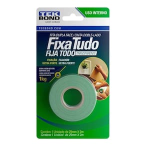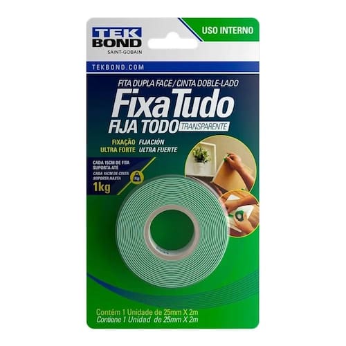 Fita dupla face para uso internoFixação ultraforteTransparenteSubstitui colas e pregosIdeal para fixar quadros, espelhos, objetos decorativos, canaletas, boiseries (molduras de parede, rodateto, rodapé e rodameio) etcAderência perfeita para madeira, parede, vidro, acrílico, cerâmica e metalPrática e fácil de usarINFORMAÇÕES TÉCNICAS: