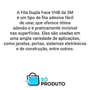 A fita dupla face vhb da 3m é um tipo de fita adesiva fácil de usar, que oferece ótima adesão e é praticamente invisível nas superfícies. Ela é altamente resistente e durável a longo prazo, sendo capaz de substituir rebites, soldas a ponto, adesivos líquidos e outros fixadores mecânicos ou permanentes. Além disso, ela tem alta resistência a solventes e cria um selo permanente contra água e umidade. A fita compensa a dilatação térmica das partes unidas, proporciona distribuição do esforço mecânico e possui colagem permanente com acabamento limpo. A fita 3m Vhb Dupla-face de espuma ig-110wf é adequada para fixação de chapas metálicas em ônibus, placas de sinalização, montagem em materiais de linha branca, entre outros. A fita é composta por adesivo acrílico durável com propriedades viscoelásticas e pode ser usada em uma ampla variedade de substratos, incluindo alumínio, aço galvanizado, inox, aço pintado, vidro, epóxi, cerâmica e muitos outros. As fitas vhb foram criadas em 1980 pela 3m como as primeiras de seu tipo, combinando conformidade e uma ligação forte e permanente, sendo uma alternativa comprovada para parafusos, rebites e outras formas de fechos mecânicos. Elas são usadas em uma ampla variedade de aplicações, como janelas, portas, sistemas eletrônicos e de construção, entre outros.