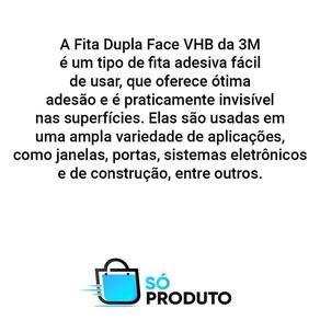 A fita dupla face vhb da 3m é um tipo de fita adesiva fácil de usar, que oferece ótima adesão e é praticamente invisível nas superfícies. Ela é altamente resistente e durável a longo prazo, sendo capaz de substituir rebites, soldas a ponto, adesivos líquidos e outros fixadores mecânicos ou permanentes. Além disso, ela tem alta resistência a solventes e cria um selo permanente contra água e umidade. A fita compensa a dilatação térmica das partes unidas, proporciona distribuição do esforço mecânico e possui colagem permanente com acabamento limpo. A fita 3m Vhb Dupla-face de espuma ig-110wf é adequada para fixação de chapas metálicas em ônibus, placas de sinalização, montagem em materiais de linha branca, entre outros. A fita é composta por adesivo acrílico durável com propriedades viscoelásticas e pode ser Utilizado em uma ampla variedade de substratos, incluindo alumínio, aço galvanizado, inox, aço pintado, vidro, epóxi, cerâmica e muitos outros. As fitas vhb foram criadas em 1980 pela 3m como as primeiras de seu tipo, combinando conformidade e uma ligação forte e permanente, sendo uma alternativa comprovada para parafusos, rebites e outras formas de fechos mecânicos. Elas são usadas em uma ampla variedade de aplicações, como janelas, portas, sistemas eletrônicos e de construção, entre outros. As imagens são meramente ilustrativas