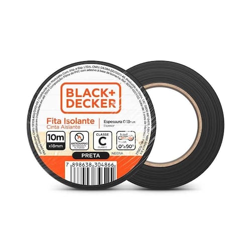 Marca: Black+Decker Modelo: BDMT-0001-02 Cor: Preta Comprimento: 10 metros Largura: 18mm Material: PVC Resistência à Tensão: Não especificado Resistência à Temperatura: Não especificado Aplicações: Isolamento elétrico Especificações do Produto: