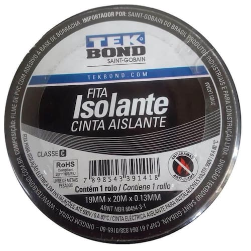 Fita Isolante 19mm X 20 Metros 0,13mm - 21131001920 - Tekbond Fita Isolante 19mm x 20 Metros 0,13mm - 21131001920 - TEKBOND Descrição sobre o produto: - Ideal para efetuar isolação elétrica para fios e cabos de energia, a fim de formar uma capa protetora altamente resistente à abrasão, e também contra ação dos raios Ultravioleta. É uma Fita para isolação elétrica de uso geral em instalações de até 600V e com temperatura entre 0 A 80C. - Anti Chamas / Atende a norma ABNT NBR 60454-3-1 / Livre de metais pesados / Classe C.
