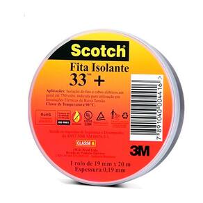 A fita 33+ é destinada ao , atendendo a todos os requisitos exigidos pelas normas nbr 5057 e 5037. É a primeira fita isolante do mercado brasileiro que suporta até 105º c, suportando até os fios e cabos mais robustos. Possui alto poder de adesão e alta conformabilidade, com ótimo custo benefício nas instalações. Oferece também proteção, segurança e alta durabilidade, pois não desgruda e não resseca ao longo dos anos. A fita 33+ tem na isolação, pois a fita acompanha o movimento de dilatação e contração dos fios e cabos. É antichama e fabricada no Brasil. Possui excelente memória elástica, garantindo perfeita isolação nas diversas condições de intempéries. Oferece bons resultados nas mais variadas superfícies, sendo especialmente indicada para os mais diversos tipos de isolamentos elétricos. A fita é um produto à base de pvc de cor preta, e possui embalagem que protege a fita de possíveis deformações e contaminações.