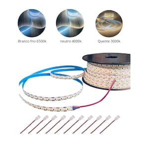Características Técnicas: Potência Total: 900w Potência por metro: 18w Fluxo luminoso: 97500Lm Cor da luz: 3000K (branco quente), 6500K (branco frio) e 4000k (branco neutro) Tensão: 12V Densidade: 240 LEDs por metro IRC: 80 Proteção: IP20