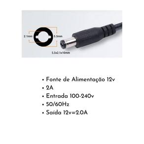 Fonte 12V - Voltagem de entrada: 100/240V Bivolt automática; - Voltagem de saída: 12v; - Amperagem: 2 Amperes; - Conector diâmetro : Plug P4 macho 2,1mm x 5,5mm - Frequência: 50/60Hz - Comprimento do cabo: 90cm