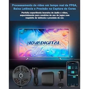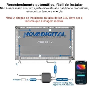 Compatíveis com televisores de 40 a 50 polegadas Kit LED Smart TV Ambilight Faça da sua TV mais moderna e dinâmica com o Kit LED Smart TV, com ela é possível transcender as cores da sua tela do que estiver assistindo fazendo com que sua experiência ao assistir um filme seja ainda mais impactante. Fácil instalação, sem a necessidade de um Pode ser controlado por aplicativo Comando de voz Alexa e Google Home Atenção :Para o produto funcionar perfeitamente na função Ambilight,é necessário utilizar uma saída HDMI 2.0 externa de um outro aparelho. AtençãoRequisitos Mínimos de Rede WI-FI:Rede wi-fi com alto desempenho, escalável, com alta capacidade interna para administração de dispositivos e com boa distribuição do sinal no local. Ideal, tipo Mesh, com capacidade para 100 ou mais dispositivos. A não observância desse requisito, poderá acarretar nos seguintes sintomas:-Oscilação na conexão do dispositivo, podendo estar off-line inesperadamente temporariamente ou por tempo indeterminado-Falha na resposta aos comandos via aplicativo, assistentes de voz e não execução de rotinas automáticas agendadas. Obs. Os modens/roteadores wi-fi entregues pelas operadoras de telecomunicações, poderão não suportar a utilização deste dispositivo. Os testes de sinal realizados por smartphones, notebooks ou demais dispositivos podem não ser considerados para a realização de testes precisos de alcance, pois possuem chips internos com capacidades diferentes, proporcionando maior recepção de sinal wi-fi.Para o correto funcionamento deste dispositivo, recomendamos a contratação de uma empresa especializada em redes wi-fi, automação e elétrica.